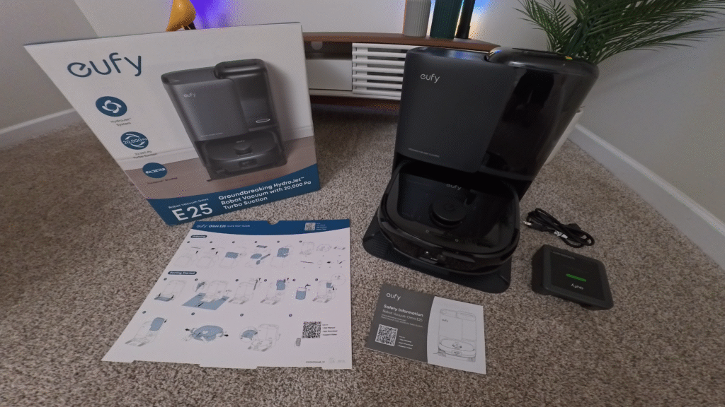 Today we are taking a close look at the Eufy E25 Robot Vacuum and Mop. It is the younger sibling to the Eufy E28, which is almost identical but adds a portable carpet cleaner to its station. Eufy did send us this unit for testing, but as always, our thoughts are completely honest. If you want to check it out, the purchase link is here: