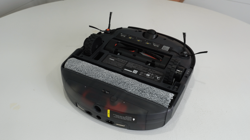 Many buyers will consider the E25 for its HydroJet mopping system which is the same one used in Eufy’s flagship S1 Pro. The roller measures 11.4 inches and covers almost the entire underside of the robot. The system constantly pulls dirty water off the roller and replaces it with clean water in real time. This prevents the smearing effect seen on traditional spinning pad systems and helps remove invisible dirt. The mop also lifts automatically when crossing carpet. There are still a few areas for improvement. A slightly extended mop roller would help with corners and edges. The lack of a mop-only mode is also frustrating, especially since vacuuming while mopping can send moisture into the dustbin. Support for lifting the main brush would solve that issue.